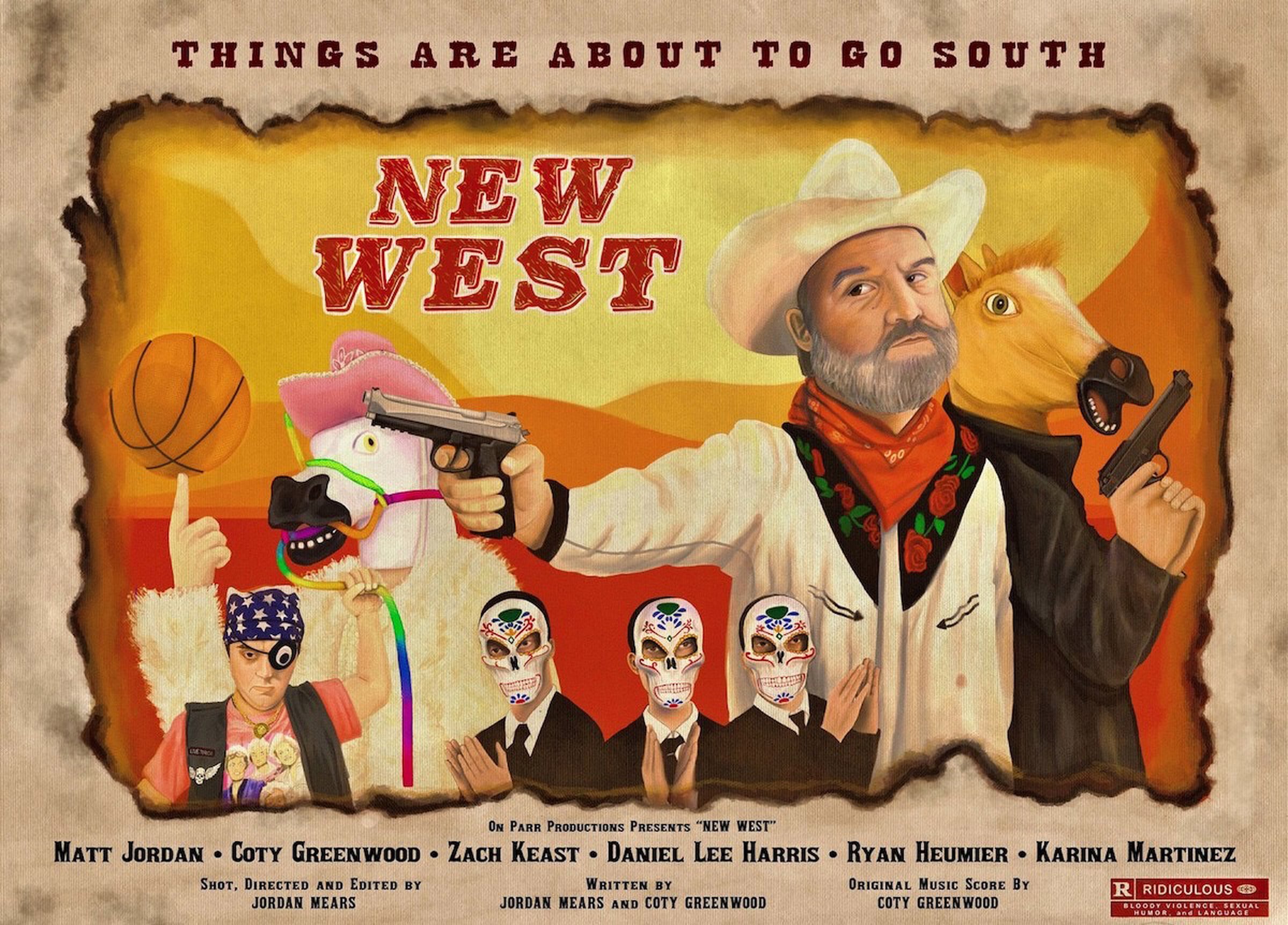 It’s been about two weeks since I watched Jordan Mears new feature film New West at its premiere at the Ron Robinson Theater in Little Rock. As everyone in the jam packed theater was laughing at the new age western about a man in a horse mask seeking revenge for the cold blooded murder of his drunken former partner in crime/former musical partner, I was sitting in my seat going through my mental rolodex of films in my head trying to figure out what movies to compare New West to… which was very difficult, as New West is incredibly irreverent, raunchy, and original. The closest thing I could compare it to was the Zucker Brother’s comedies of the 80s and 90s, like Naked Gun and Airplane.