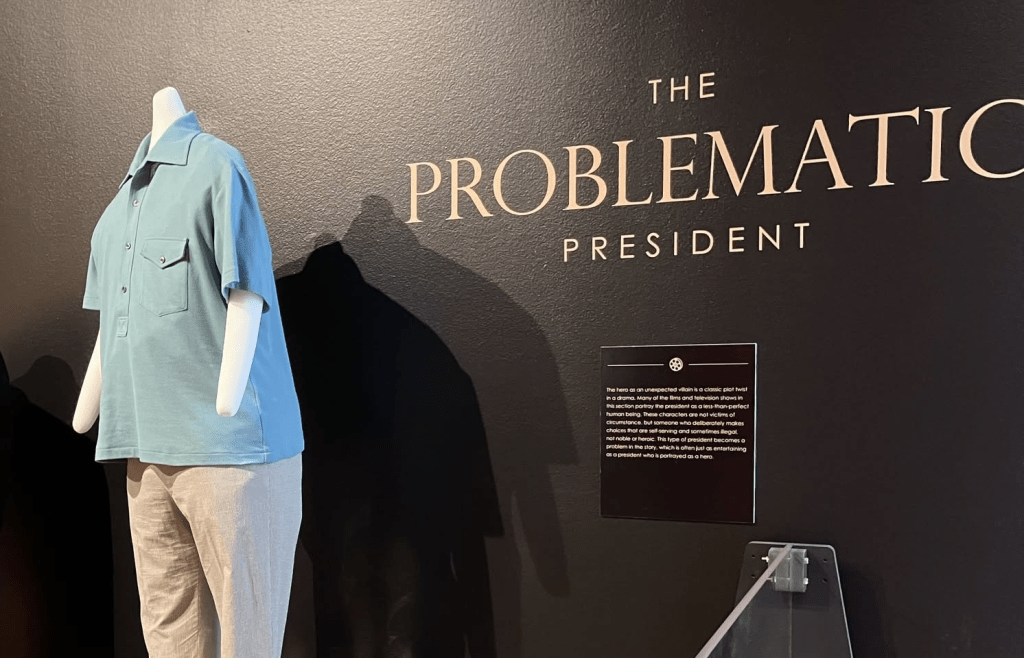 Ascending to the third floor of the Clinton Library, you pass the presidential limo and replicas of both the Cabinet Room and the Oval Office—two spaces that have been recreated countless times on screen. The first thing you see upon entering the exhibit is two suits: one blue, one black. The blue suit was worn by Morgan Freeman as President Tom Beck in Deep Impact, as he solemnly informs the world that a meteor is on a collision course with Earth. The black suit belonged to Danny Glover’s President Thomas Wilson in 2012, another leader facing an apocalyptic disaster. Fictional presidents often seem to grapple with threats of staggering magnitude—be it meteors (Armageddon), aliens (Independence Day), vampires (Abraham Lincoln: Vampire Hunter), or even video game characters (Pixels).